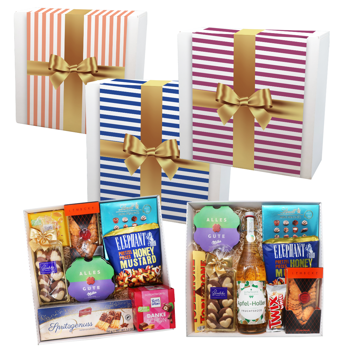 Wähle zunächst die Farbe der Verpackung und im nächsten Schritt maximal 10 Artikel, die wir für dich in die Box packen. Lege deine Auswahl im letzten Schritt in den Warenkorb. Jede Box wird mit Holzwolle ausgelegt, um die Produkte zu schützen. Die Box misst circa: 330x325x110mm.